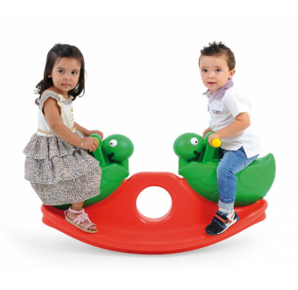 Gangorra dupla para ser utlizada por duas crianças. Possui assentos anatômicos, cores atraentes e olhos móveis, que promovem a interatividade no brinquedo, fazendo com que a criança possa criar expressões diferentes.