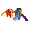 . Playground modular em formato quadrado com andar superior e inferior. Paredes com aberturas que permitem a passagem e a instalação dos componentes: 1 escorregador em curva (grande), 1 escorregador em onda (grande), 1 escalada (grande), 1 túnel;