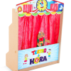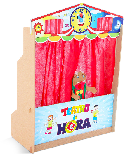 Confeccionado em M.D.F. usinado, composto por 5 peças de M.D.F. podendo ser utilizado para fantoches, dedoches, bonecos, etc. Contém bandô em M.D.F. pintado e serigrafado em policromia ultravioleta atóxica, com as seguintes ilustrações: Sol – representando o dia de um lado, e lua – representando a noite do outro lado. Ao meio, um relógio com 2 ponteiros de E.V.A. 2 pequenas janelas para dedoches, com cortininhas de T.N.T. Abaixo do bandô, 1 janela grande, com 2 pares de cortina, presas por um varal de madeira fixas no teatro.(OBS: As cortinas podem ser: Vermelha ou azul). 2 laterais para sustentação do teatro e 1 peça frontal que forma a base do teatro, pintada e serigrafada em policromia ultravioleta atóxica. Medida do teatro montado: 80 x 35 x 107 cm. (Ob.: Fantoches, dedoches e bonecos não acompanham o produto). Embalagem: Caixa de papelão.