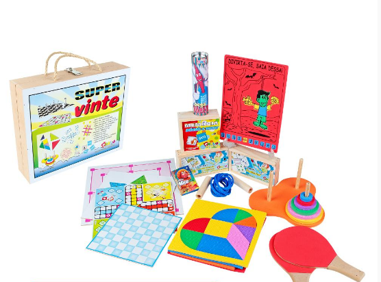 Kit composto por 20 jogos: Tangram tradicional, tangram ovo, tangram coração, tangram círculo, dominó tradicional, torre de Hanói, jogo do mico, pega varetas, ludo, trilha, resta um, xadrez, damas, raquetes, jogo da velha, jogo da forca, dama chinesa, pula corda, memória e dominó. Acondicionados em uma maleta de M.D.F. com tampa pintada e serigrafada em policromia ultravioleta atóxica com alças de sisal nas laterais e 1 tranca cadeado medindo 40 x 33 x 9,5 cm. Embalagem: Papelão.