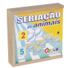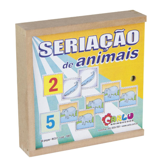 Confeccionado em M.D.F. 54 peças de 4,5 x 4,5 cm. Peças pintadas e serigrafadas em policromia ultravioleta atóxica em uma das faces, com figuras de animais e peças com números relacionado a quantidade das figuras (números de 1 ao 9. Ex: 1 Sapo – n° 1; 2 Baleias – n° 2; etc). Embalagem: Caixa de madeira com tampa serigrafada medindo 18 x 18 x 4 cm. Lacrada com película de P.V.C. encolhível.