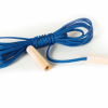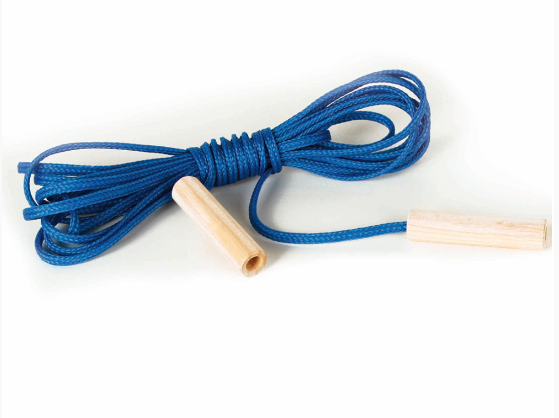 Pula corda com 2 metros de comprimento, cabos de madeira (empunhadeira) e corda de nylon. Embalagem: Saco plástico com solapa colorida em papel couchê.