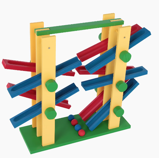 Confeccionado em madeira e M.D.F. colorido com 10 rampas e 04 bolinhas coloridas (02 de cada cor: azul e vermelha) pintadas com tinta atóxica. Jogo medindo: 52 x 18 x 42,5 cm. Embalagem: Caixa de papelão.