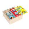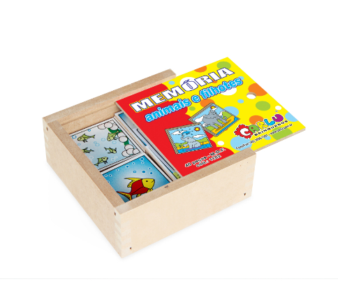 Confeccionado em M.D.F. 20 pares  totalizando 40 peças de 5 x 5 cm cada, serigrafadas em policromia ultravioleta atóxica. Embalagem: Caixa de madeira com tampa serigrafada medindo 12,5 x 12,5 x 5 cm cada. Lacrada com película de P.V.C. encolhível.