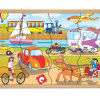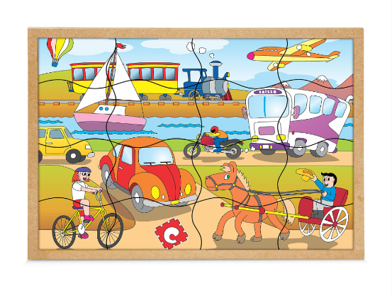 Confeccionado em M.D.F. composto por 16 peças, pintadas e serigrafadas em policromia ultravioleta atóxica. Ilustração: Meios de transportes: carro, bicicleta, avião, cavalo com carroça, etc. Medidas do quebra-cabeça montado: 30 x 23 cm. 1 Base de M.D.F. com fundo em baixo relevo (para montar o quebra-cabeça), medindo 33,5 x 26,5 cm. Embalagem: Película de P.V.C. encolhível.