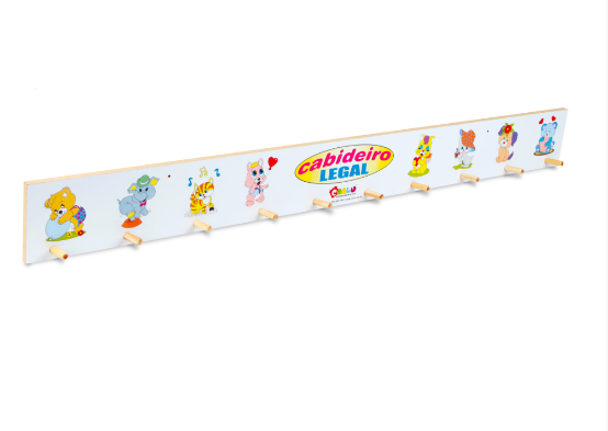 Cabide de parede confeccionado em M.D.F. e madeira medindo 102 x 5,5 x 11 cm, pintado e serigrafado com tinta ultravioleta atóxica. Possui 10 suportes fixos de madeira medindo 4 cm cada. Embalagem: Plástico bolha e/ou papelão.