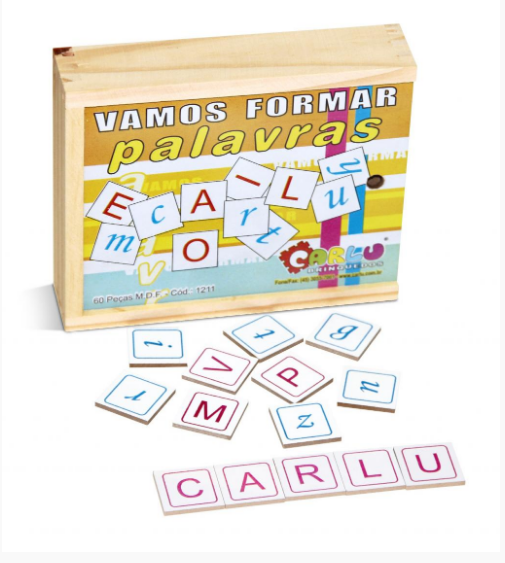 Confeccionado em M.D.F. Composto por 60 peças, medindo 3 x 3 cm, serigrafada em ambos os lados com tinta ultravioleta atóxica. Embalagem: Caixa de madeira com tampa serigrafada medindo 18 x 15 x 4 cm. Lacrada com película de P.V.C. encolhível.