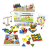 Conjunto composto por 10 brinquedos:  Relógio cuco, Bate martelo, Balança, Caixas coloridas, Passa Formas Geométricas, Pinos de Encaixe, Figuras Geométricas, Mosaico triângulo, Sequência de unidades e Torre de Formas. Acondicionados em maleta M.D.F. medindo 43 x 27 x 23 cm, com tampa serigrafada, 2 alças de sisal e tranca cadeado. Embalagem: Papelão.