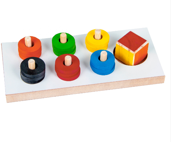 Confeccionado em M.D.F. Composto por 1 base medindo 20 x 9 x 5 cm com 06 varetas e 18 argolinhas de M.D.F. pintadas com tinta atóxica (nas cores azul, verde, vermelho, preto, laranja e amarelo) e 01 dado de madeira com as 6 faces coloridas nas cores das argolinhas, medindo 3 x 3 x 3 cm. Embalagem: Película de P.V.C. encolhível.