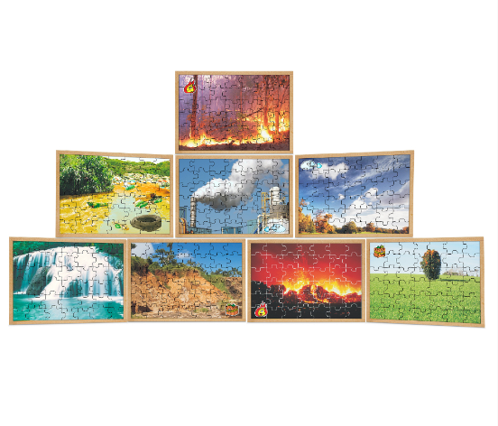 Esse quebra-cabeça mostra para as crianças quais os elementos da natureza: terra, ar, água e fogo, abordando também os desastres ambientais.