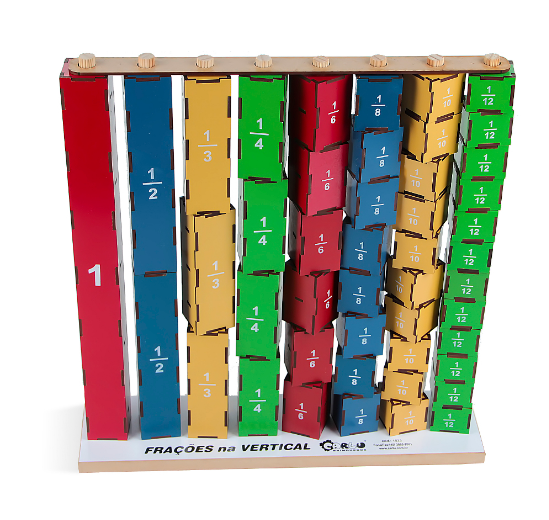 Confeccionado em M.D.F. 46 peças – 1 suporte/base de M.D.F. Possui 08 torres nas cores vermelho, verde, azul e amarelo, pintadas e serigrafadas com tinta ultravioleta atóxica representando as frações: 1 inteiro, 1/2, 1/3, 1/4, 1/6, 1/8, 1/10 e 1/12 avos, acompanha 1 trava de proteção para as torres. Medindo da base/frações: 43 x 41 x 10 cm. Embalagem: Película de P.V.C. encolhível.