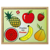 Confeccionado em M.D.F. 21 peças mais 1 base. Peças pintadas e serigrafadas com tinta atóxica, com ilustrações de frutas, representado as frações (Morango = 1 inteiro; Pera = 1/2; Banana = 1/3; Maçã = 1/4; Abacaxi = 1/5 e Melancia = 1/6). Medida: 33,5 x 26,5 cm. Embalagem: Película de P.V.C. encolhível.