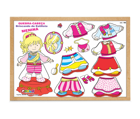 Confeccionado em M.D.F. composto por 9 peças cortadas a laser, pintadas e serigrafadas em policromia ultravioleta atóxica. Ilustração: Menina com peças de roupas para trocar. 1 Base de M.D.F. com fundo em baixo relevo (para montar o quebra-cabeça), medindo 33,5 x 26,5 cm. Embalagem: Película de P.V.C. encolhível.