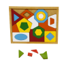 Confeccionado em M.D.F. Base M.D.F. com fundo em baixo relevo (para montar o quebra-cabeça), medindo 33,5 x 26,5 cm, com 24 peças coloridas (formas variadas), pintadas com tinta ultravioleta atóxica, que se encaixam e formam o quebra-cabeça. Embalagem: Película de P.V.C. encolhível.
