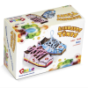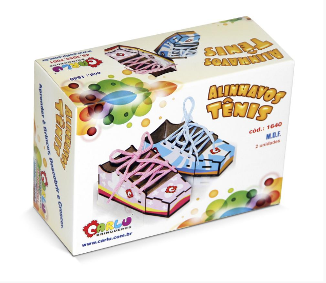Confeccionado em M.D.F. composto por 2 alinhavos de tênis coloridos, serigrafados em policromia ultravioleta atóxica. Medida do tênis: 15 x 6 x 6 cm. Acompanha 2 cadarços de poliéster colorido de aproximadamente 90 cm. Embalagem: Caixa de papel cartonado ilustrado, medindo 17 x 12 x 7 cm. Lacrada com película de P.V.C. encolhível.