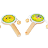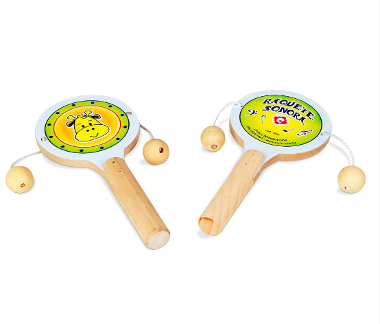 Instrumento musical de percussão confeccionado em madeira e M.D.F., composta por 2 unidades de raquetes, pintadas e serigrafadas em policromia ultravioleta atóxica em ambas as faces em uma face a ilustração da cabecinha de uma girafa e na outra face o nome do o instrumento e letras musicais, nas laterias bolinhas de madeira presas por cordão de nylon (uma em cada lado da raquete) cabo de madeira cru. Raquete medindo: 10 x 21 cm. Embalagem: Saco plástico com solapa colorida em papel couchê.