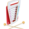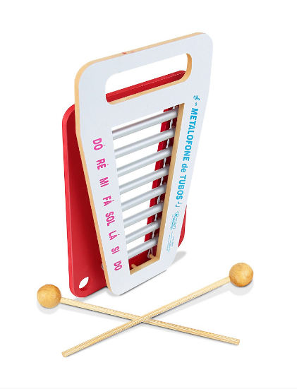 Confeccionado em madeira, metal e M.D.F. Composto por 8 tubos sonoros em metal. Base pintada com tinta atóxica. Acompanha 2 baquetas de madeira medindo 17 cm. Metalofone medindo: 23 x 37 x 4 cm. Embalagem: Película de P.V.C. encolhível.