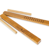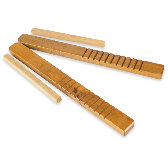 Instrumento musical de percussão, 01 par confeccionado em madeira envernizada, em um dos lados contém talhos transversais (para emitir sons através da raspagem da baqueta), em outro lado serigrafia com nome do instrumento. Acompanha baqueta de madeira medindo 16 cm. Reco-Reco medindo 30 x 3 x 1,5 cm.