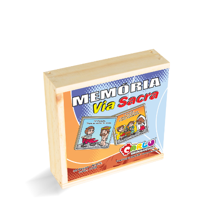Confeccionado em M.D.F. composto por 15 pares (30 peças de 7,5 x 7,5 cm cada). Cada figura está associada a outra peça, serigrafadas em uma das faces em policromia ultravioleta atóxica a ilustração das 15 Estações da Via Sacra (com personagens infantilizados). Embalagem: Caixa de madeira com tampa serigrafada medindo 18 x 18 x 5 cm. Lacrada com película de P.V.C. encolhível.