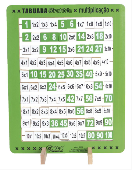 Tabuada de multiplicação na vertical com pezinhos giratório, confeccionada em M.D.F. composta por 100 quadradinhos. Pintada e serigrafada com tinta ultravioleta atóxica em ambos os lados, de um lado a continha  para chegar no resultado, do outro lado o número correspondente ao resultado da tabuada. Cada quadradinho mede 3 x 3 cm. Medida total da tabuada: 38 x 16 x 48  cm. Embalagem: Película de P.V.C. encolhível.