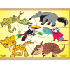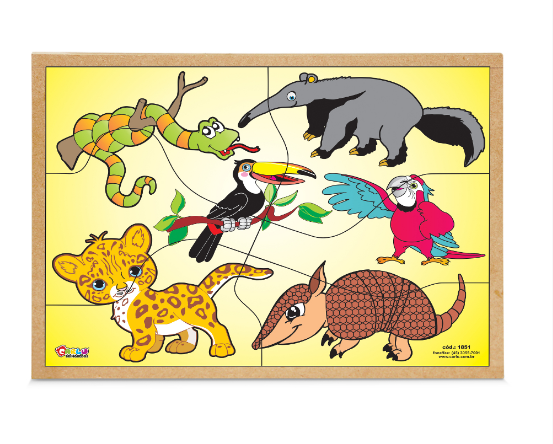 Confeccionado em M.D.F. Base de M.D.F. com fundo em baixo relevo (para montar o quebra-cabeça), medindo 33,5 x 26,5 cm, com 6 peças coloridas pintadas e serigrafadas em uma das faces em policromia ultravioleta atóxica. Ilustração: Animais da Fauna brasileira (Cobra, tamanduá, onça, arara, tucano e tatu). Embalagem: Película de P.V.C. encolhível.