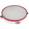 Instrumento musical de percussão, confeccionado em P.V.C. e metal. Pandeiro em forma circular, nos intervalos ao redor do aro de P.V.C. contém 04 pares de platinelas de metal. Medida: 24 x 4 cm. Embalagem: Saco plástico com solapa colorida em papel couchê.