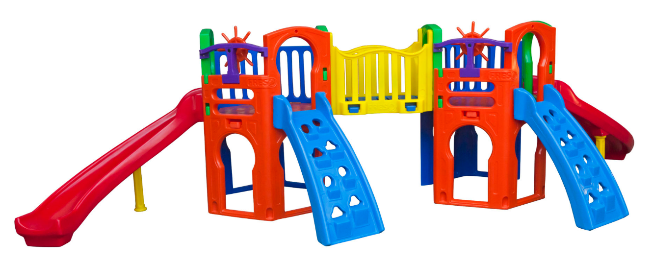 Em dobro é melhor! Duas rampas de escalada, dois escorregadores, a diversão vai ser duplicada para todas as crianças!