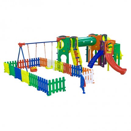 • Possui múltiplas atividades : 1 escalada, 2 escadas de degraus alternados, 1 escada tradicional com 6 degraus, escorregador tubo reto (1 ou 2), 1 escorregador curvo grande, labirinto inferior e 1 balanço com 1 cadeirinha de balanço com protetor frontal e 1 assento
