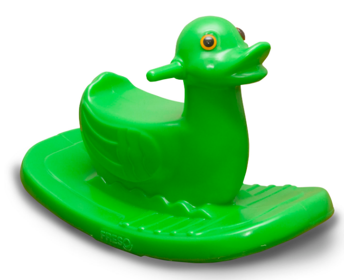 - gangorra em forma de patinho para 1 criança com 2 pegadores laterais e olhos de acrílico