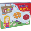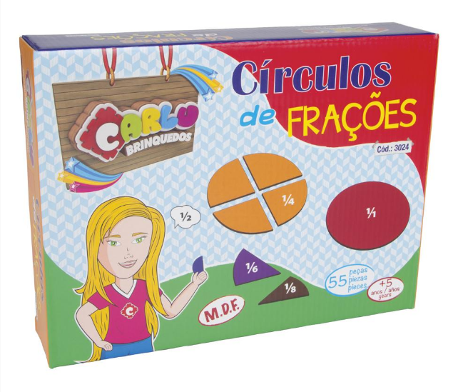 Composto por 55 peças, confeccionado em M.D.F. com pintura atóxica. Cores representando as frações: 1 inteiro – vermelho, 1/2 – azul, 1/3 – verde, 1/4 – amarelo, 1/5 – laranja, 1/6 – lilás, 1/7 – rosa, 1/8 – marrom, 1/9 – cinza, 1/10 – preto (Formam círculos de 10 cm de diâmetro). Embalagem: Caixa papel microondulado medindo 23 x 18 x 5 cm. Lacrada com película de P.V.C. encolhível.
