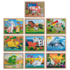 Kit de quebra-cabeça contendo 10 jogos, sendo cada quebra-cabeça ilustrações de animais e filhotes com corte diferenciado (Vaca, Coelho, Cavalo, Dinossauro, Pássaro, Leão, Macaco, Cachorro, Golfinho e Cisne.). Peças de M.D.F. pintadas e serigrafadas em policromia ultravioleta atóxica. 10 Bases de M.D.F. com fundo em baixo relevo (para montar o quebra-cabeça), cada base mede: 33,5 x 26,5 cm. Embalagem: Película de P.V.C.