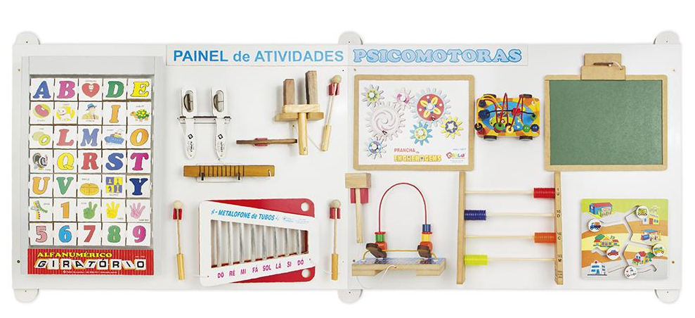 Painel de atividades psicomotoras Confeccionado em M.D.F. Madeira. P.V.C. e metal, Composto por 11 atividades distribuídas em brinquedos de atividades e brinquedos sonoros, fixos no painel. Brinquedos de atividades: 01 Alfanumérico giratório, 01 Prancha de engrenagem, 01 Aramado carrinho, 01 Quadrinho Lousa com apagador, 01 Encontre o percurso, 01 Ábaco aluno argolas de plástico, 01 Aramando bate com martelo. Brinquedos Sonoros: 01 reco reco de madeira, 01 metalofone tubos, 01 par de platinelas e 01 agogô. Medida do produto: 184 x 15 x 75,5 cm. Embalagem: Papelão. Indicado para crianças a partir de 2 anos.