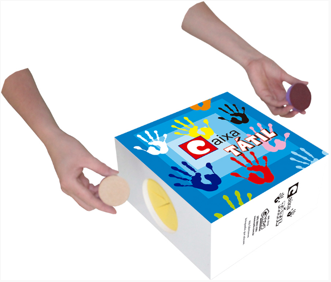 Confeccionada em M.D.F. E.V.A. feltro, lixa e espuma. Composta por uma caixa pintada e serigrafada com tinta ultravioleta atóxica com orífícios revestidos em E.V.A. colorido, acompanha 16 círculos (8 pares) de M.D.F. e E.V.A. Com texturas diferentes (lixas, feltro, E.V.A. e espuma). Caixa medindo: 25 x 25 x 12,5 cm. Peças medindo: M.D.F. mede 4,5 cm e E.V.A. mede 5 cm de diâmetro. Embalagem: Película de P.V.C. encolhível.