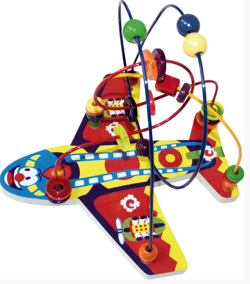 Brinquedo confeccionado em madeira, M.D.F. plástico e arame. Composto por 03 circuitos e 25 peças de formas variadas e coloridas. Arame resistente e pintado com tinta atóxica. Base com forma de avião toda serigrafada e ilustrada com tinta em policromia ultravioleta atóxica, peças pintadas com tinta atóxica colorida. Medida do produto: 27,5 x 27,5 x 25 cm. Embalagem:  Película de P.V.C. encolhível.