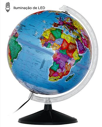 Globo Terrestre Político confeccionado em acrílico e plástico e LED branco, diferencia os países por cores em degradê, com os 50 maiotes lagos, rios e ilhas do mundo. Os vulcões ativos e inativos, divisão interestadual do Brasil e os países integrantes da União Européia e os do Mercosul. Contém informações Demográficas, geográficas, fuso horário, régua dos meridianos e na base os pontos Cardeais em alto Relevo. Globo equipado com LED branco de 5 W e multivoltagem: 110/220 volts. Na base os pontos Cardeais em alto Relevo. Com diâmetro de 30 cm e Escala de 1:42.000.000. Montado mede: 45 cm x 35 cm. Embalagem: Caixa de papelão.