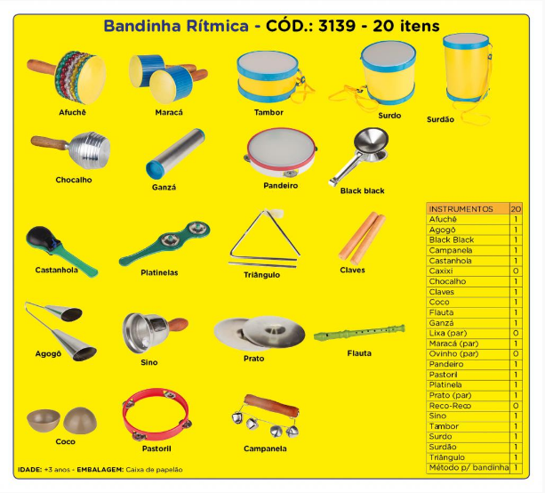 Afuchê (01 unid.): Lateral com bolinhas de poliestireno colorido 12mm, cabo em madeira. Medida: 10 x 18 cm. Agogô (01 unid.):  Duas (02) canecas em cromado medindo 11,5cm de comprimento, na extremidade maior 5 cm de boca, na menor 2 cm e outra de 14 cm de comprimento e na extremidade maior 5,5 cm de boca e na menor 2 cm, Medida: 14,5 x 31,5 cm Acompanha batedor de madeira com comprimento de 20cm. Black Black (01 unid.): Dois (02) pratos com diâmetro de 7 cm, confeccionado em aço cromado. Medida: 7 x 16,5 cm. Campanela  (01 unid.): Composto por quatro (04) guizos com diâmetro de 2,4 cm, cromado, cabo de madeira, medida: 2,4 x 10 cm. Castanhola (01 unid):  Composto por duas (02) conchas de 8,2 cm de comprimento por 7,5 cm de largura, cabo de plástico 20 cm de comprimento. Chocalho (01 unid): Confeccionado em alumínio polido no comprimento de 98mm por 98mm de largura, com cabo de madeira de 100mm de comprimento por 26mm de largura, sementes de soja extra seca. Claves (01 unid): Duas (02) peças sólidas em madeira de lei polida na medida de 20 cm de comprimento por 2, 5 cm de espessura. Coco (01 unid): Duas (02) metades artificiais de coco confeccionadas em plástico, medida: 5,8 cm x 10 cm. Flauta (01 unid.): Confeccionada em plástico, medida: 32 cm x 3 cm, contendo 13 orifícios para executar melodias, acompanha manual (guia didático). Ganzá (01 unid.): Dois (02) copos confeccionados em alumínio, medida: 21,5 cm x 6 cm, sementes de soja extra secas. Maraca (par – 01 unid.): Confeccionada em tubo, cabo de madeira,sementes de soja extra seca, medida: 7,5 x 18 cm.  Pandeiro (01 unid.): confeccionado em poliestireno, medida: 20 cm de diâmetro x 3,5 cm, 2 conjuntos de 02 platinelas de 4 cm. Pastoril (01 unid.): Confeccionado em plástico, medida: 20 cm de diâmetro x 3,5 cm, contendo 04 conjuntos de 02 platinelas. Platinelas (01 unid.): Confeccionada plástico e alumínio, medida: 22 cm x 6 cm,com 02 conjuntos de 02 platinelas com 4 cm de diâmetro.   Prato (par – 01 unid.): Duas peças em formato de prato, confeccionadas em aço com medida: 20 cm de diâmetro. Contém alça para prender entres os dedos.  Sino (01 unid.): Confeccionado em aço, campana nas medidas de 5,5 cm x 6 cm de diâmetro x 11 cm, badalo em plástico com 16 m de diâmetro (atendendo as normas de não utilização de chumbo).Tambor (01 unid.): Confeccionado em Poliéster e Prolipropileno colorido com bordas superior e inferior em Prolipropileno. Medida: 21 x 10 cm. Acompanha 02 baquetas plásticas de 21 cm e correia de ombro.Triângulo com batedor (01 unid.): Confeccionado em aço (em forma de um  triângulo aberto), acompanha batedor em aço, medida: 18 x 18 cm. Surdo (01 unid.): Confeccionado em Poliéster e Prolipropileno colorido com bordas superior e inferior em Prolipropileno, medida: 21 x 16 cm. Acompanha 02 baquetas plásticas de 21 cm e correia de ombro. Surdão (01 unid.): Confeccionado em Poliéster e Prolipropileno colorido com bordas superior e inferior em Prolipropileno, medida: 21 x 26 cm. Acompanha 02 baquetas plásticas de 21 cm e correia de ombro.  Acompanha 01 Método para bandinha. Embalagem: Caixa de papelão.