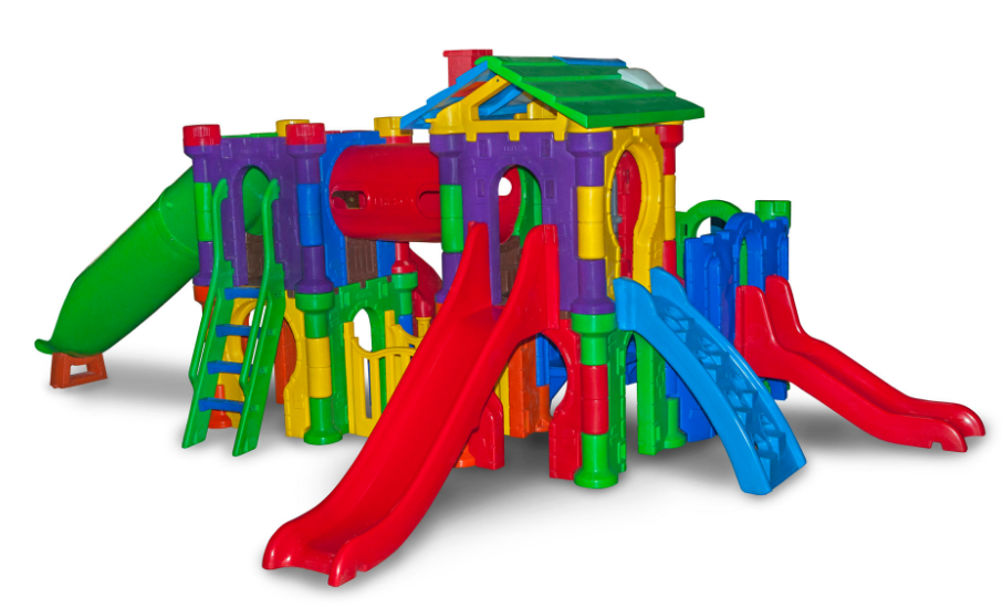 - os 4 lados do brinquedo são ocupados por atividades, sendo : escorregador tubo reto, escorregador curvo grande, escalada grande com orifícios vazados e saliências, escada com 4 degraus e corrimãos em plástico rotomoldado