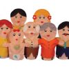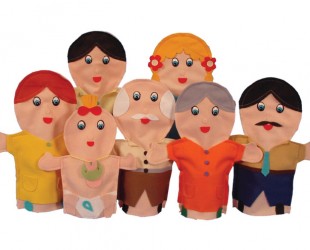 Conjunto de Fantoches Família Branca, para criar e contar histórias. Composto por: Vovó, Vovô, Papai, Mamãe, Bebê, Menina e Menino.