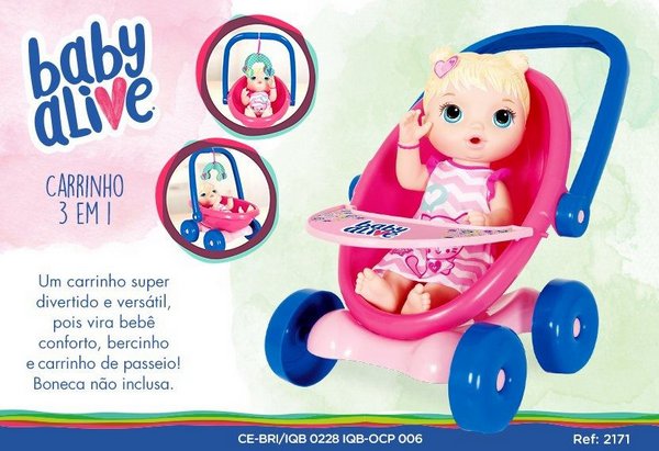 Um carrinho super divertido e versátil, pois vira bebê conforto, bercinho e carrinho de passeio! Boneca não inclusa.