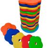 Conjunto de almofadas em espuma de 4 centimetros de espessura, no formato de flores, confeccionadas em corino colorido, acomodadas em um suporte para facilitar armazenamento e transporte que podem ser espalhadas no momento das atividades.