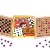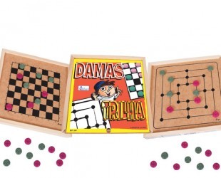 Material: Plástico – 24 peças (19x19x5 mm). Embalagem: Madeira – 249x249x29 mm (com tabuleiros de Damas e Trilhas). Faixa etária: a partir de 04 anos.