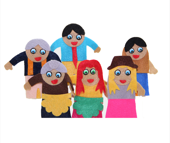 Kit composto por 06 personagens medindo entre: 9 e 10 cm de altura. Corpo, cabeça e detalhes dos personagens em feltro colorido. Olhos de plástico. Personagens: Vovô, Vovó, papai, mamãe, menino e menina. OBS: As cores podem variar. Embalagem: Saco plástico com solapa colorida em papel couchê.