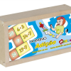 Confeccionado em M.D.F. 28 peças de 7 x 3,5 cm, pintada e serigrafada com tinta ultravioleta atóxica em uma das faces. Embalagem: Caixa de madeira com tampa serigrafada medindo 17 x 9,5 x 4 cm. Lacrada com película de P.V.C. encolhível.
