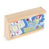 Confeccionado em M.D.F. 28 peças de 7 x 3,5 cm, pintada e serigrafada com tinta ultravioleta atóxica em uma das faces. Embalagem: Caixa de madeira com tampa serigrafada medindo 17 x 9,5 x 4 cm. Lacrada com película de P.V.C. encolhível.