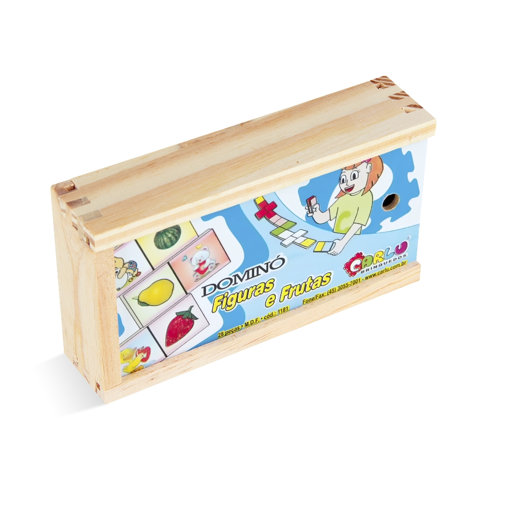 Confeccionado em M.D.F. 28 peças de 7 x 3,5 cm, pintada e serigrafada com tinta ultravioleta atóxica em uma das faces. Embalagem: Caixa de madeira com tampa serigrafada medindo 17 x 9,5 x 4 cm. Lacrada com película de P.V.C. encolhível.