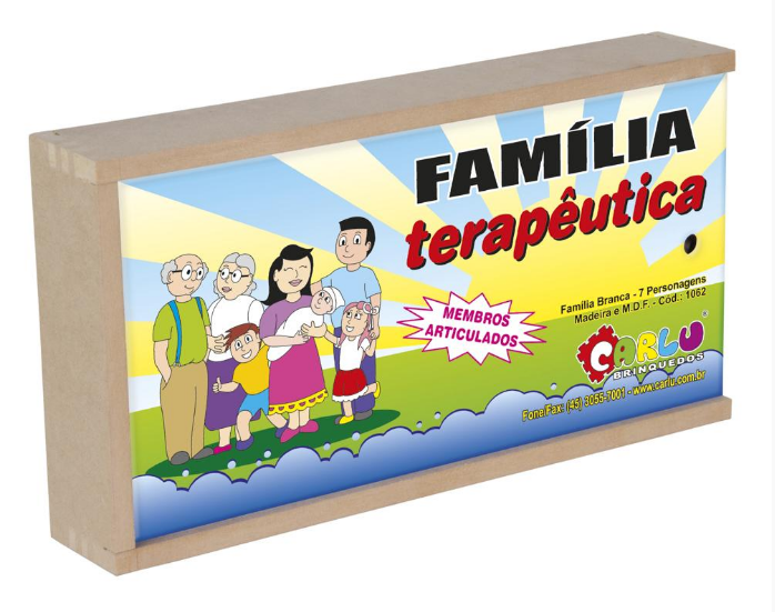 Bonecos de madeira e tecido, articulados, personalizados conforme característica e pintados com tinta atóxica, composto por 7 personagens: Vovô, Vovó, Papai, Mamãe, Bebê, Menina e Menino. Embalagem: Caixa de M.D.F. com tampa serigrafada, medindo 30 x 16 x 5 cm. Lacrada com película de P.V.C. encolhível.
