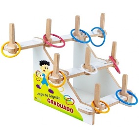 Confeccionado em M.D.F. 14 peças serigrafadas em policromia ultravioleta atóxica. 3 Andares. 1° andar – 33 x 7 cm, com 2 pinos e pontuação 15; 2° andar – 43 x 7 cm, com 3 pinos – 2 com a pontuação 50 e 1 com a pontuação 30; 3° andar – 62,5 x 7 cm, com 4 pinos – 2 com a pontuação 70 e 2 com a pontuação 100. Acompanha 15 argolas coloridas de plástico resistente, sendo 9 argolas de 10 cm de diâmetro e 6 argolas de 8 cm de diâmetro. Medida da base graduada montada: 63 x 36 x 39 cm. Embalagem: Caixa de M.D.F. medindo 43 x 33 x 7,5 cm. Lacrada com película de P.V.C. encolhível.