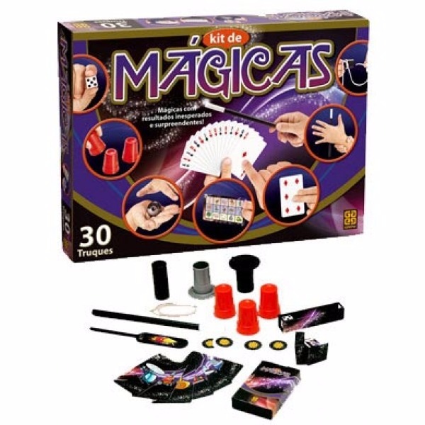 | Componentes | 6 cartas com figuras, 1 bloco de papel, 2 dados, 1 túnel com aberturas, 1 varinha mágica, 1 conjde fichas brancas (2 verdadeiras e 2 falsas), 3 covilhetes, 4 espuminhas, 1 corda grande, 2 pedaços de corda, 1 cartela-astronauta, 1 tubo, 1 caixa mágica, 1 cubo ilustrado, 1 nota Grow, 1 elástico, 2 clipes, 1 esfera, 1 tubo preto, 1 tubo prata, 6 fichas, 1 cartelas de adesivos, 1 palheta, 1 carta especial, 1 cartela com 15 figuras numeradas, 4 cartelas com 8 figuras sem números, 1 baralho completo e manual de instruções