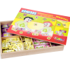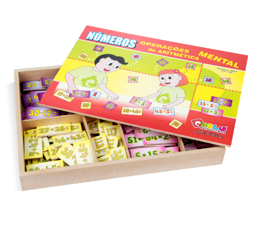 Confeccionado em M.D.F. 160 peças, pintadas e serigrafadas em policromia ultravioleta atóxica em uma das faces, com operações nas peças maiores e resultados nas peças menores (Ex.: 18+18 = 36) Medida das peças: Peças menores 3 x 3 cm e peças maiores 7 x 3,5 cm. Embalagem: Caixa de M.D.F. com divisórias interna e tampa serigrafada medindo 40 x 30 x 5 cm. Lacrada com película de P.V.C. encolhível.