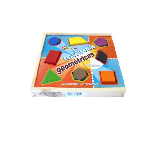 Confeccionado em M.D.F. 8 formas geométricas (Triângulo, círculo, quadrado, retângulo, pentágono, trapésio, hexágono, losango) coloridas pintadas com tinta atóxica. Embalagem: Caixa de madeira com tampa serigrafada, vazada nas formas geométricas medindo 24 x 24 x 3,5 cm. Lacrada com película de P.V.C. encolhível.